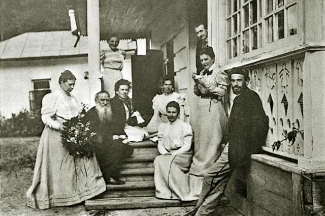 Inset photo: Leo Tolstoy in his study room at Yasnaya Polyana, 1909 (Vladimir Chertkov); Photo 1: Leo Tolstoy with his family members and guests on the porch of his house at Yasnaya Polyana, 1899 (RIA Novosti); Photo 2: Stable at the Museum complex, nowadays (RussPass Magazine) — Your Academic Cat